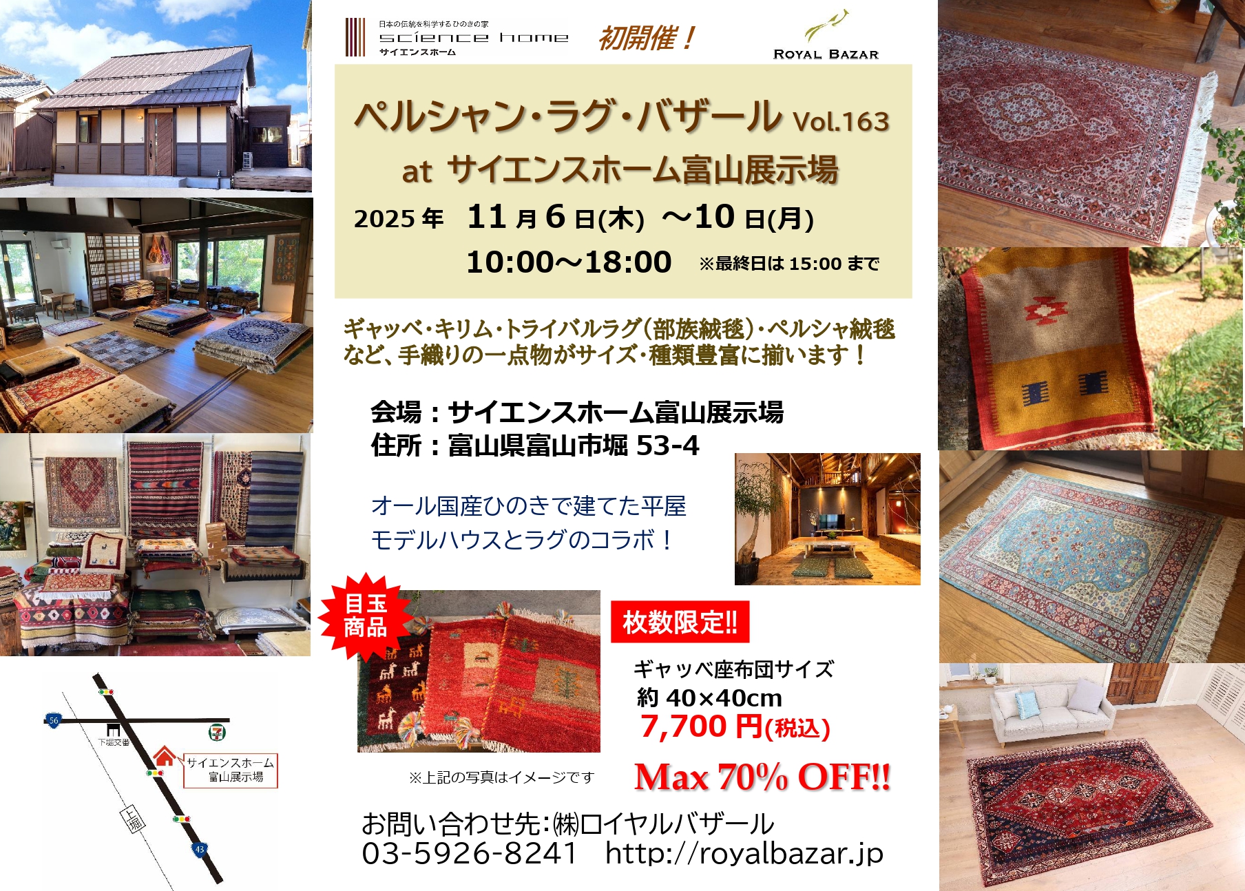 11月6日(木)~10日(月)の5日間、富山市の「サイエンスホーム富山展示場」にてペルシャン・ラグ・バザール Vol.163を行います!木のぬくもりたっぷりの素敵なモデルハウスとペルシャンラグのコラボをぜひお楽しみください!