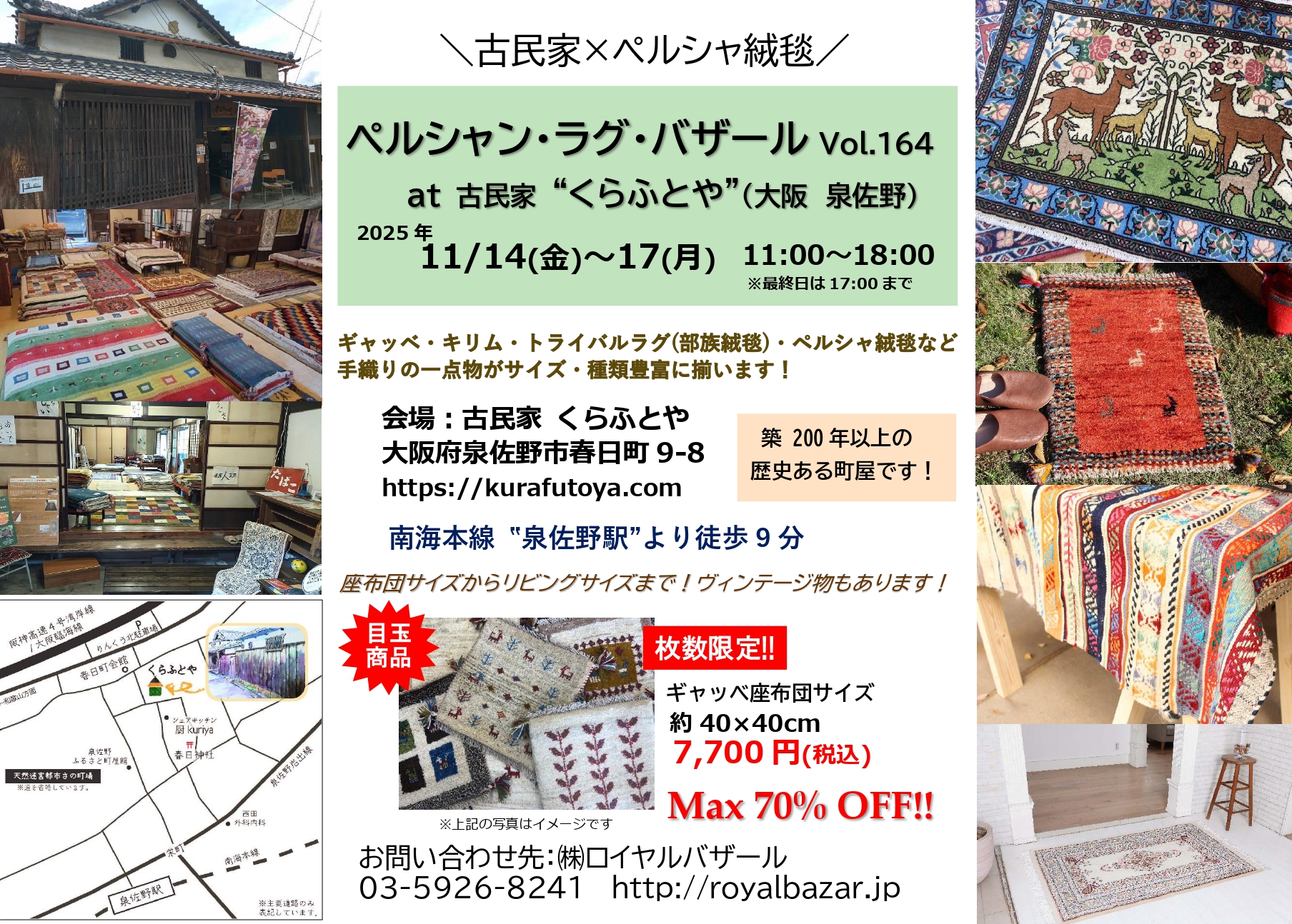 11月14日(金)~17日(月)の4日間、大阪府泉佐野市の「くらふとや」にてペルシャン・ラグ・バザール Vol.164を行います!旧市街の町家を改装した趣深い古民家にて秋のバザールをお楽しみください!
