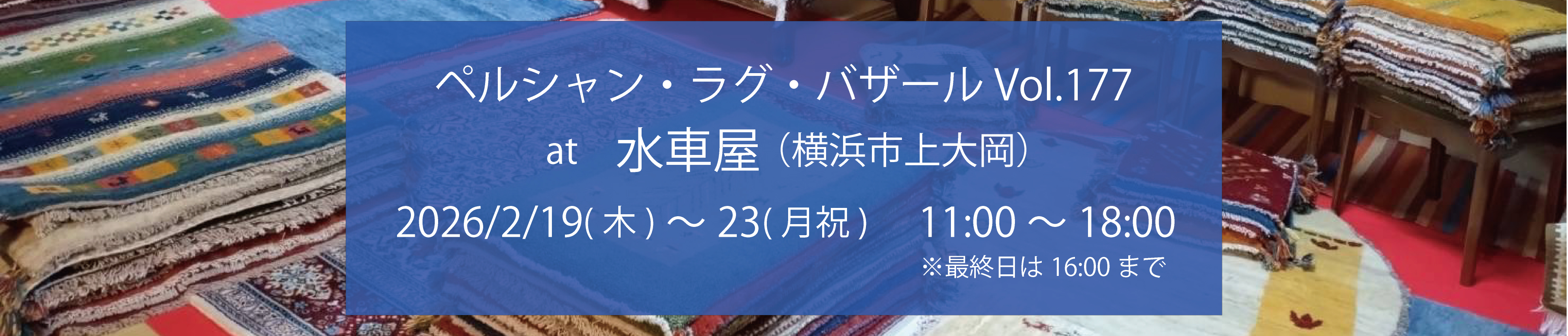 2月19日(木)~23日(月祝)の5日間、横浜市上大岡の古民家「水車屋」にてペルシャン・ラグ・バザール Vol.177を行います。明治時代初頭から続く歴史的な古民家にてたっぷりとラグをご覧ください!
