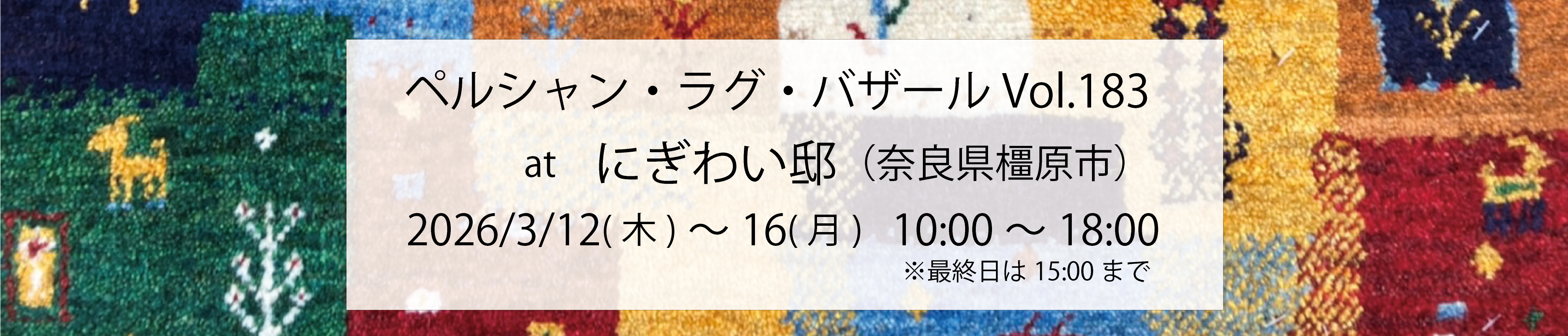 3月12日(木)~16日(月)の5日間、奈良県橿原市の「今井町にぎわい邸」にてペルシャン・ラグ・バザール Vol.183を行います。長い歴史を持つ今井町の町屋とペルシャン・ラグのコラボをご堪能ください!
