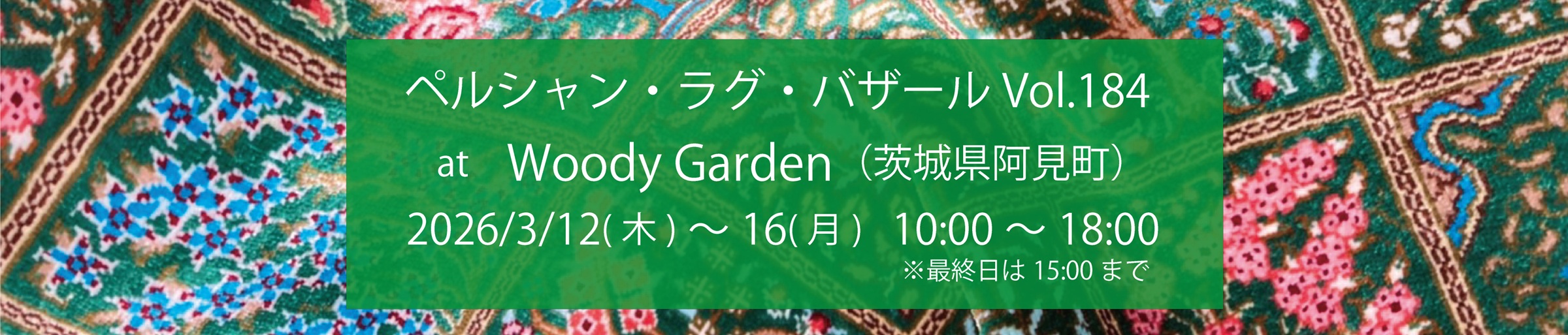 3月12日(木)~16日(月)の5日間、茨城県阿見町の「Woody Garden」にてペルシャン・ラグ・バザール Vol.184を行います。素敵なガーデンに囲まれた大きな敷地にある古民家で、木の香りに包まれながらラグをご覧ください!