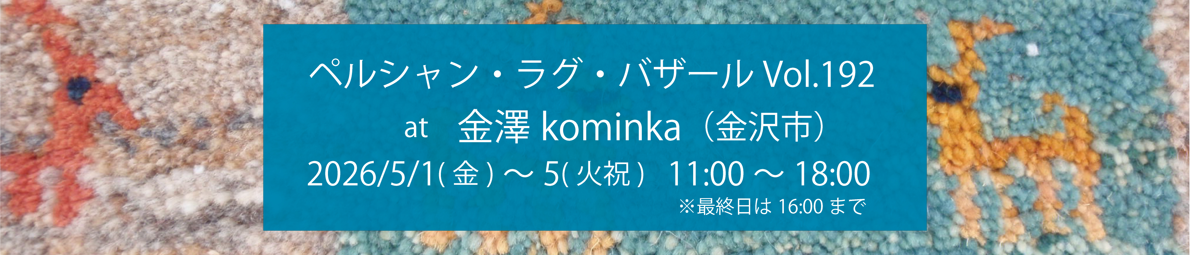5月1日(金)~5日(火祝)の5日間、金沢市の「金澤kominka」にてペルシャン・ラグ・バザール Vol.192を行います!川べりののどかな古民家でラグを見ながらGWをお過ごしください!