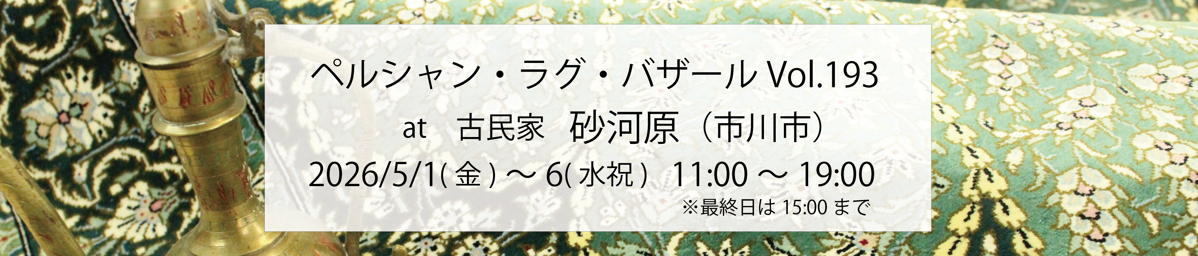 4月9日(木)~13日(月)の5日間、水戸市の「ゆずり葉」にてペルシャン・ラグ・バザール Vol.189を行います!癒しのカフェギャラリーにてごゆっくりラグ時間をお愉しみください。