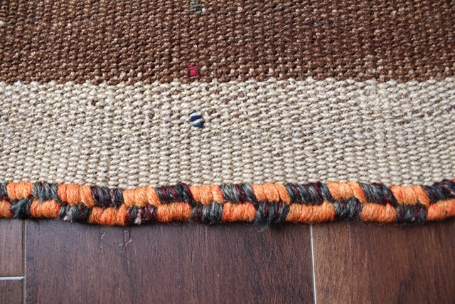 ※写真で示している通り、縦半分に縫い目があります。これは小さな幅の織り機しか持っていなかった遊牧民が、幅の狭いラグを二枚織り継ぎ合わせるという工夫によるものです。