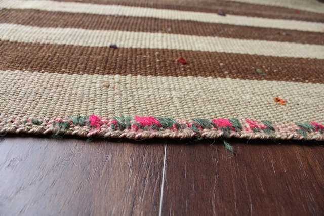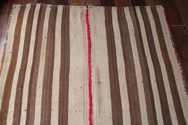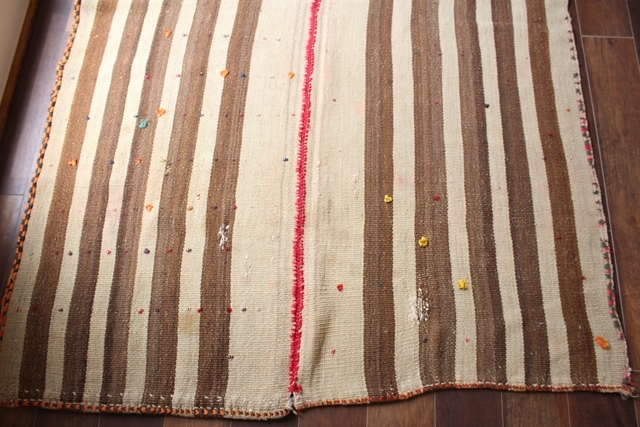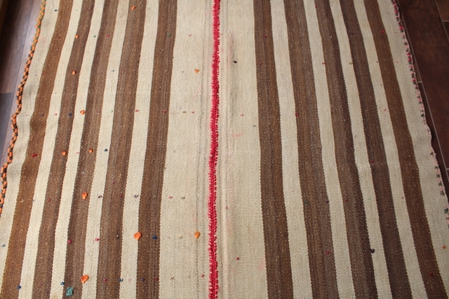 【レア!!】 ペルシャの゛ジャジーム”。オールド・キリムの一種です。 日本の市場ではあまり流通していないレアものです。 アンティーク・ヴィンテージ・古民家・ナチュラルインテリアなどとの相性抜群。 遊牧民がラグとして、またテントを彩るマルチカバーとして使っていたもの。 モダン化した現代では20年前からほとんど作られておらず、リメイク品としてバッグや小さなラグなどに加工されて流通しているものはありますが、完全な状態で残っているものは数少ないです。 ナチュラルなウール素材。シンプルなベージュのストライプ柄。細部のデザインも凝っています。 トライバルな雰囲気でデザインも風合いもとってもかわいいです。 フロア・ラグにしたりデッキに敷いたり、ピクニックやアウトドアにと、ご自由にお使いください。 幾世代にもわたって使い続けられる一生物で、時を経るごとに味わいが増しそうです。 サイズ:約218×145cm 厚さ:約0.5cm 素材:綿&ウール ※写真で示している通り、縦半分に縫い目があります。これは小さな幅の織り機しか持っていなかった遊牧民が、幅の狭いラグを二枚織り継ぎ合わせるという工夫によるものです。