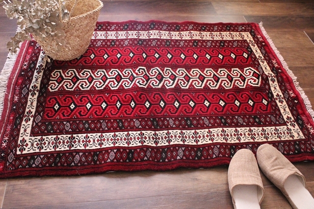 バルーチ絨毯ならではの渋めの赤色と大人っぽい模様でフロアを一気にシックに演出してくれます。