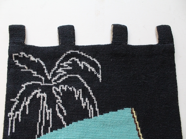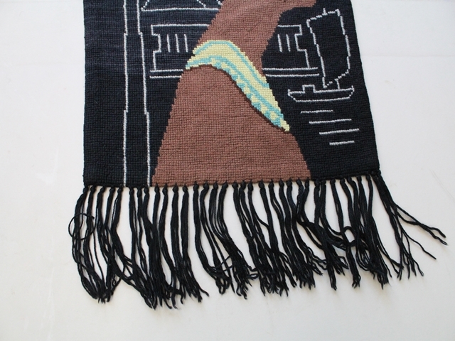 ペルシャの骨董市で見つけた珍しいデザインのタペストリーです。 約30~34年前の品。 古代オリエントのトロピカルな雰囲気がたまりません。 レトロで非常にレアな品です。 サイズ:75×44cm(フリンジを除く) フリンジの長さ:約15cm 厚み:0.5cm 素材:ウール
