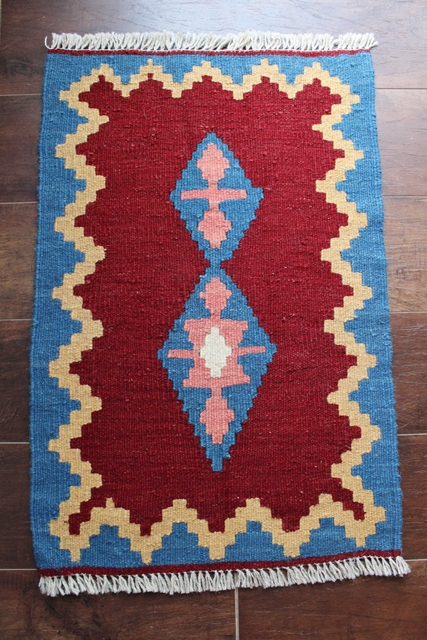 イラン南西部、シラーズ地方の遊牧民が織り上げたかわいい手織りのキリム。 一点物なので模様や色が一枚一枚異なります。 素朴な配色センス、手作りの温かさにあふれた手触り、かわいいサイズ、どこから見ても満点のアイテムです。 お手頃な価格も魅力。 表裏リバーシブルで使えます。 サイズ:約60cm×40cm 素材:ウール100%