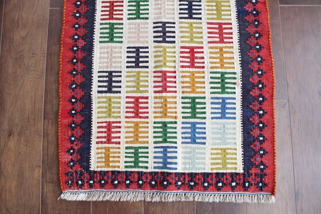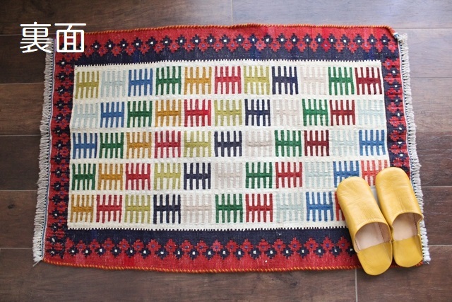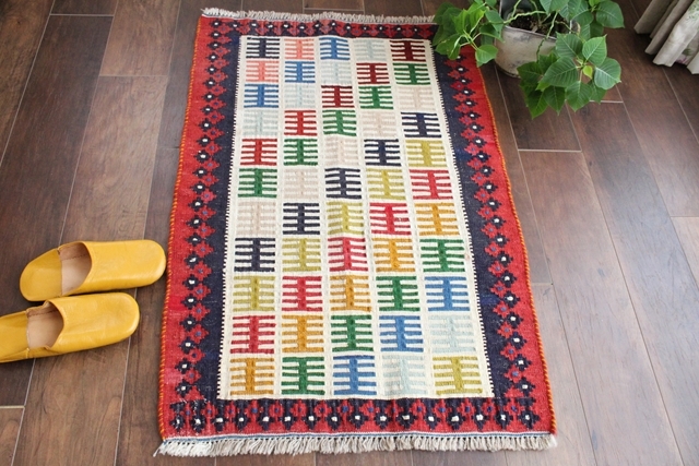 【ポップなトライバル・キリム】 ペルシャのトライバル柄がカラフルに織り込まれた上質なキリム。 明るくナチュラルにエスニックをお部屋に取り入れられます。 織りが細かく高品質な一枚。 長い年月使い続ければ、いい具合にヴィンテージ感も出てくるでしょう。 玄関マットにすれば玄関が明るくオシャレに。 リビングや寝室の家具のサイドスペースに、ベランダや出窓の前に…とマルチに使えます。 時々模様替えして楽しんでもいいですね。 サイズ:96×66cm(房を除く) 厚さ:約0.4cm 房の長さ:約2cm 素材:ウール