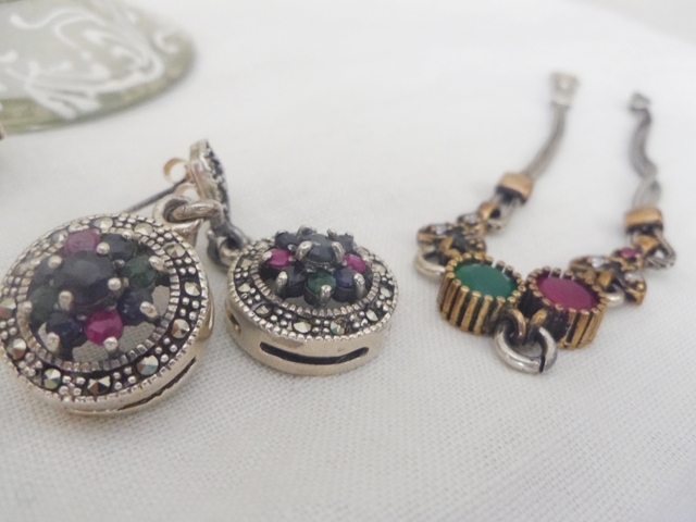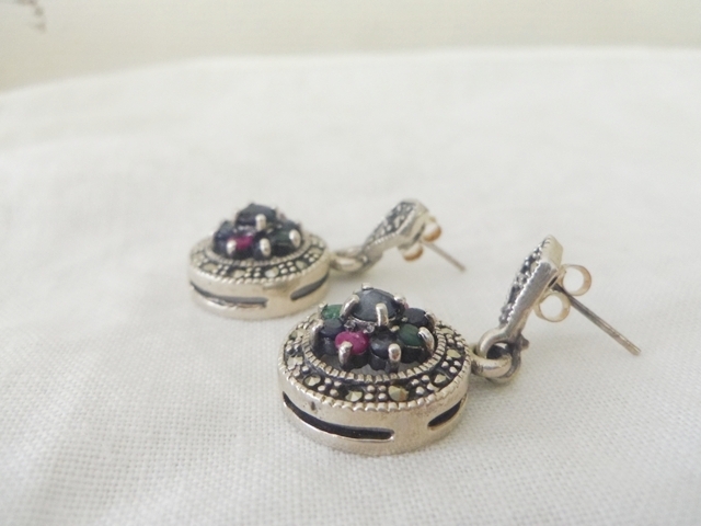 きらきらしたマルカジットに彩られたシルバーの土台に色とりどりのストーンがちりばめられています。アンティーク調のデザインがシックで重厚感のある雰囲気。