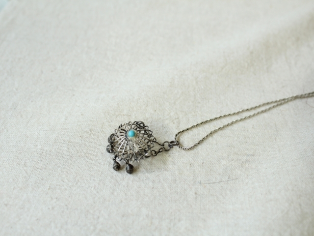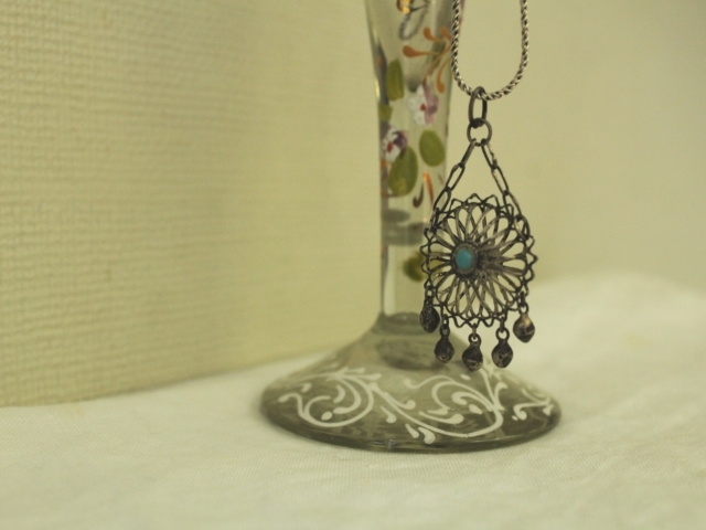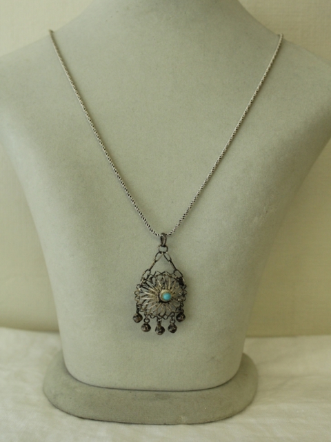 ペルシャのバザールで見つけた細工のこまかいエキゾチックなペンダントヘッド。真ん中にターコイズがはめ込まれています。