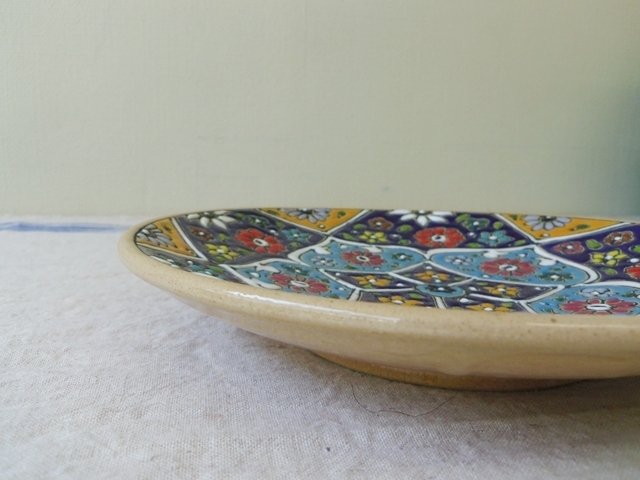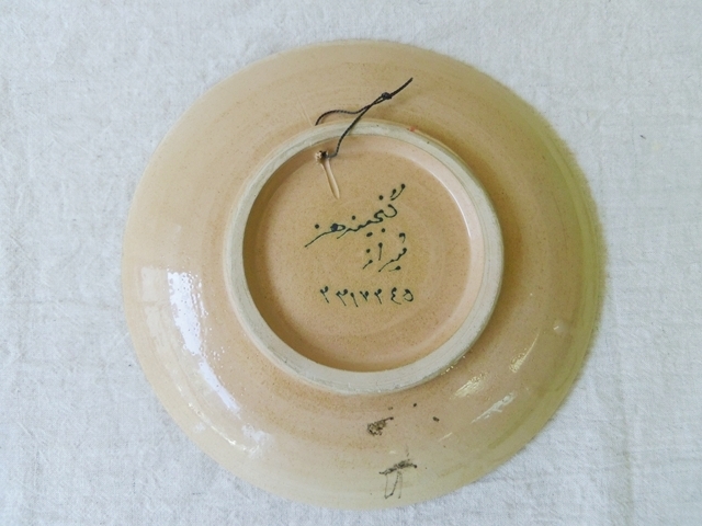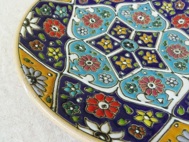 イランの中央部に位置する古い小さな町、アバデーで作られた見事な陶器。タイルのような繊細な模様と独特な色使いにうっとりします。 裏側に留め具がついているので、壁掛けにしても素敵。
