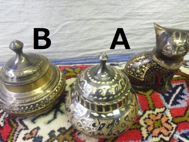 ペルシャの伝統的製法により手掘り模様が施された銅製の砂糖入れ。
