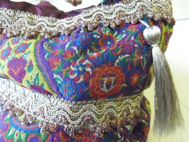 【ペルシャの伝統製法テルメ】ペルシャで縁起がいいとされている伝統的な模様を施した華やかなテルメ・ファブリック製品です。サイズ:高さ約20cm/マチ部分 直径19cm