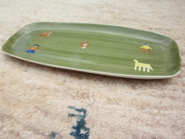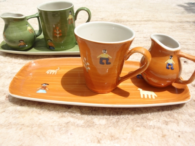 遊牧民のじゅうたん、ギャッベの素朴な絵柄が陶器の食器に描かれています。